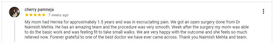 My mom had Hernia for approximately 1.5 years and was in excruciating pain. We got an open surgery done from Dr Naimish Mehta. He has an amazing team and the procedure was very smooth. Week after the surgery my mom was able to do the basic work and was feeling fit to take small walks. We are very happy with the outcome and she feels so much relieved now. Forever grateful to one of the best doctor we have ever came across. Thank you Naimish Mehta and team.