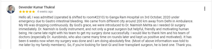 Hello all, I was admitted (operated & shifted to room#2310) to Ganga Ram Hospital on 3rd October, 2020 under emergency due to Gastro intestinal bleeding. We came from different city around 200 km away from Delhi in Ambulance. My Hb was dropping continuously. By God’s grace, we were introduced to Dr. Naimish Mehta as I needed GI surgery immediately. Dr. Naimish is Godly instrument, and not only a great surgeon but helpful, friendly and motivating human being. He came late night with his team to get my surgery done successfully. I would like to thank him and his team of doctors (especially Dr. Aurobindo, who also came many time on rounds later and kept us positive and motivated). It has been 6 weeks now when my surgery was done and I am doing absolutely fine. (Most of above information was told to me later by my family members). So, if you’re looking for best GI and liver transplant surgeon, he is best one. Thank you.