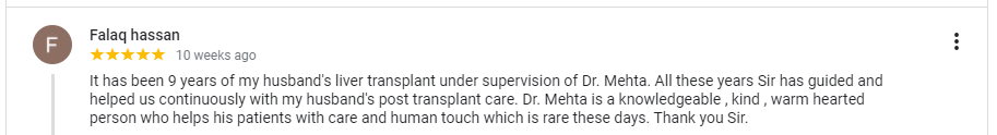 It has been 9 years of my husband’s liver transplant under supervision of Dr. Mehta. All these years Sir has guided and helped us continuously with my husband’s post transplant care. Dr. Mehta is a knowledgeable , kind , warm hearted person who helps his patients with care and human touch which is rare these days. Thank you Sir.
