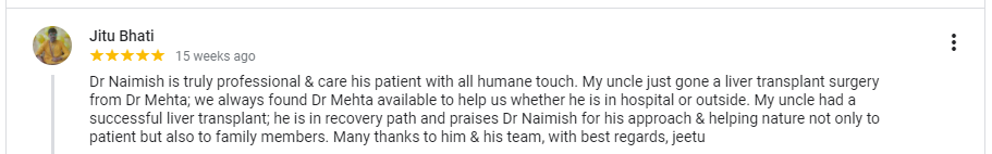 Dr Naimish is truly professional & care his patient with all humane touch. My uncle just gone a liver transplant surgery from Dr Mehta; we always found Dr Mehta available to help us whether he is in hospital or outside. My uncle had a successful liver transplant; he is in recovery path and praises Dr Naimish for his approach & helping nature not only to patient but also to family members. Many thanks to him & his team, with best regards, jeetu