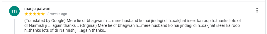 Mere lie dr bhagwan h … mere husband ko nai jindagi di h..sakjhat iseer ka roop h..thanks lots of dr Naimish ji … again thanks .. (Original) Mere lie dr bhagwan h…mere husband ko nai jindagi di h..sakjhat iseer ka roop h..thanks lots of dr Naimish ji…again thanks..