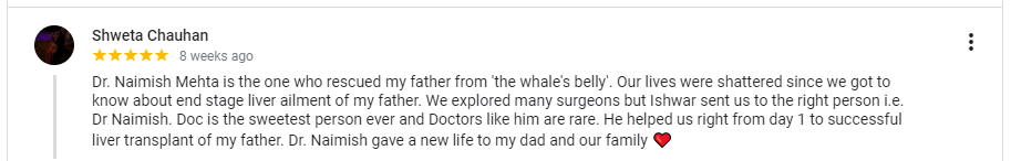 Dr. Naimish Mehta is the one who rescued my father from ‘the whale’s belly’. Our lives were shattered since we got to know about end stage liver ailment of my father. We explored many surgeons but Ishwar sent us to the right person i.e. Dr Naimish. Doc is the sweetest person ever and Doctors like him are rare. He helped us right from day 1 to successful liver transplant of my father. Dr. Naimish gave a new life to my dad and our family ❤️