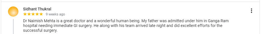 Dr Naimish Mehta is a great doctor and a wonderful human being. My father was admitted under him in Ganga Ram hospital needing immediate GI surgery. He along with his team arrived late at night and did excellent efforts for the successful surgery.